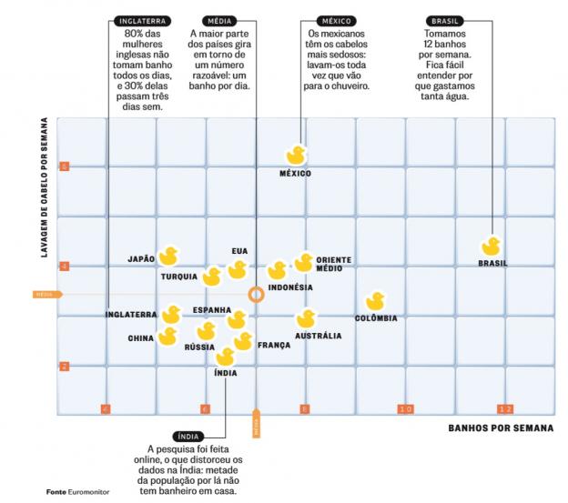 A pesquisa revelou que a média global é de um banho por dia e de 6 banhos semanais. Outro dado que chamou a atenção foi a quantidade de vezes em média que lavamos a cabeça durante a semana que são de quatro vezes, perdendo somente para os mexicanos que lavam a cabeça todas as vezes que tomam banho.