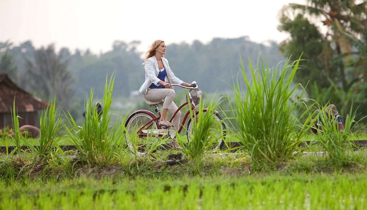 A última parada é Bali, na Indonésia, e aí o filme encontra um equilíbrio gostoso entre leveza e maturidade. Liz já não chega como alguém tentando provar alguma coisa; ela chega mais alerta aos próprios limites.